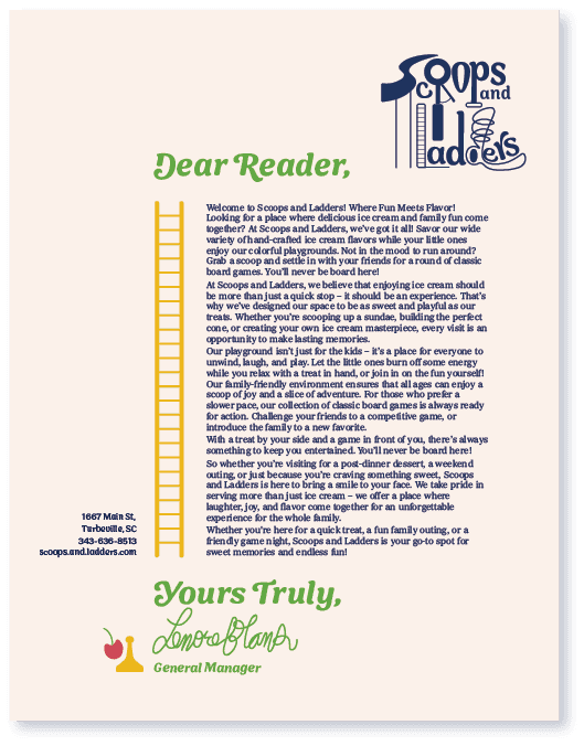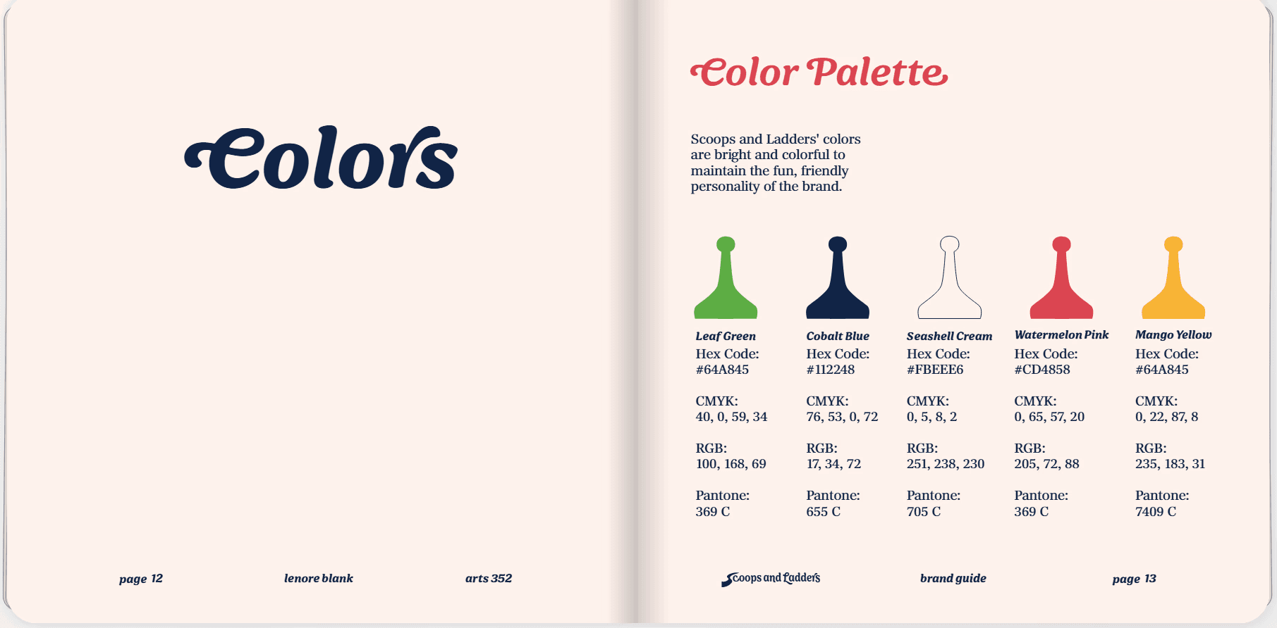 Scoops and Ladders is branding for a playground based, community-minded ice cream shop. I developed brand research and a strategy which informed my choices for the brand identity. The designs are playful to create a safe and welcoming place for families and their kids. The style guide for Scoops and Ladders is complete with rules of appropriate uses of the logo, type, and colors.